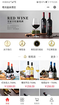 紹興葡尚皇家酒莊小程序是紹興魔方網絡科技有限公司2019年度開發的微信小程序,小程序頁面設計時尚簡潔,是愛品味紅酒和收藏紅酒購買小程序,開發了首頁商城、分類、購物車、我的中心等等模塊。